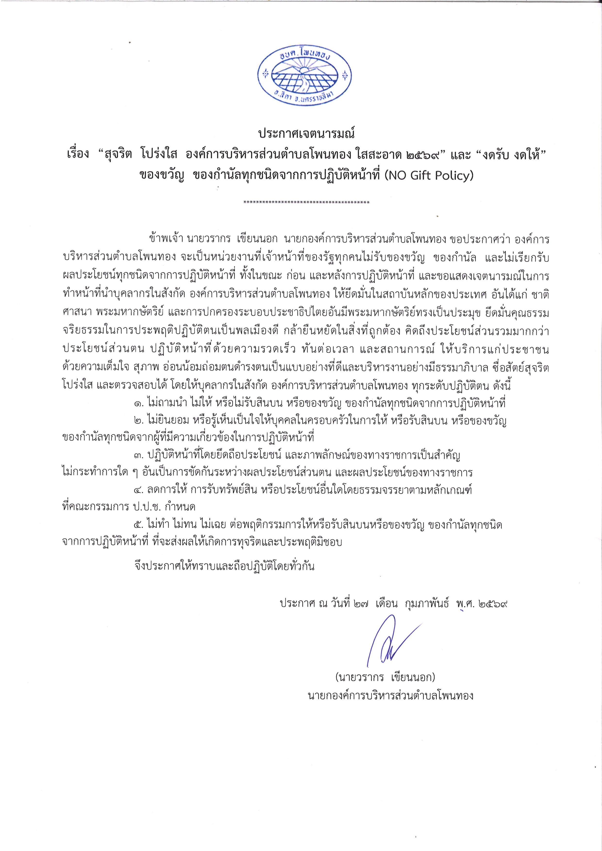 องค์การบริหารส่วนตำบลโพนทอง ประกาศเจตนารมณ์ เรื่อง "สุจริต โปร่งใส องค์การบริหารส่วนตำบลโพนทอง ใสสะอาด 2569" และ "งดรับ งดให้" ของขวัญ ของกำนัลทุกชนิดจากการปฏิบัติหน้าที่ (No Gift Policy) ภาษาไทย